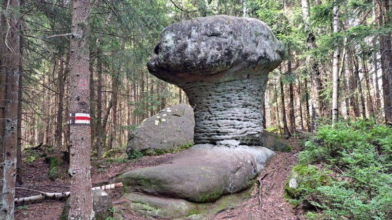 Zejście do Studzienna i rozpoczyna się podejście na Szczeliniec. Najpierw 'Rogacz’, potem 'Dwa Borowiki’ i inne skalne grzyby, są nawet 'Grzyby Bliżniaki’.
